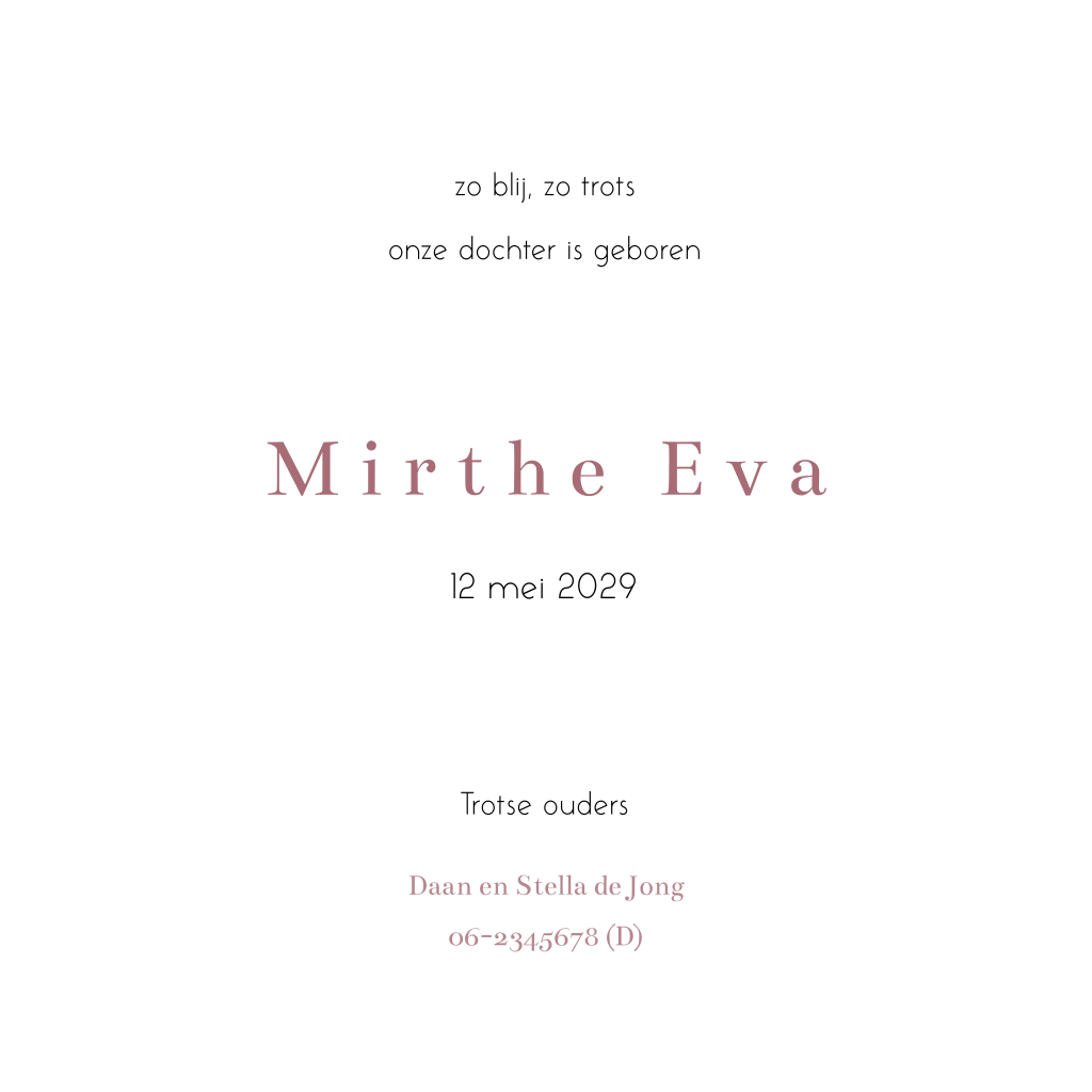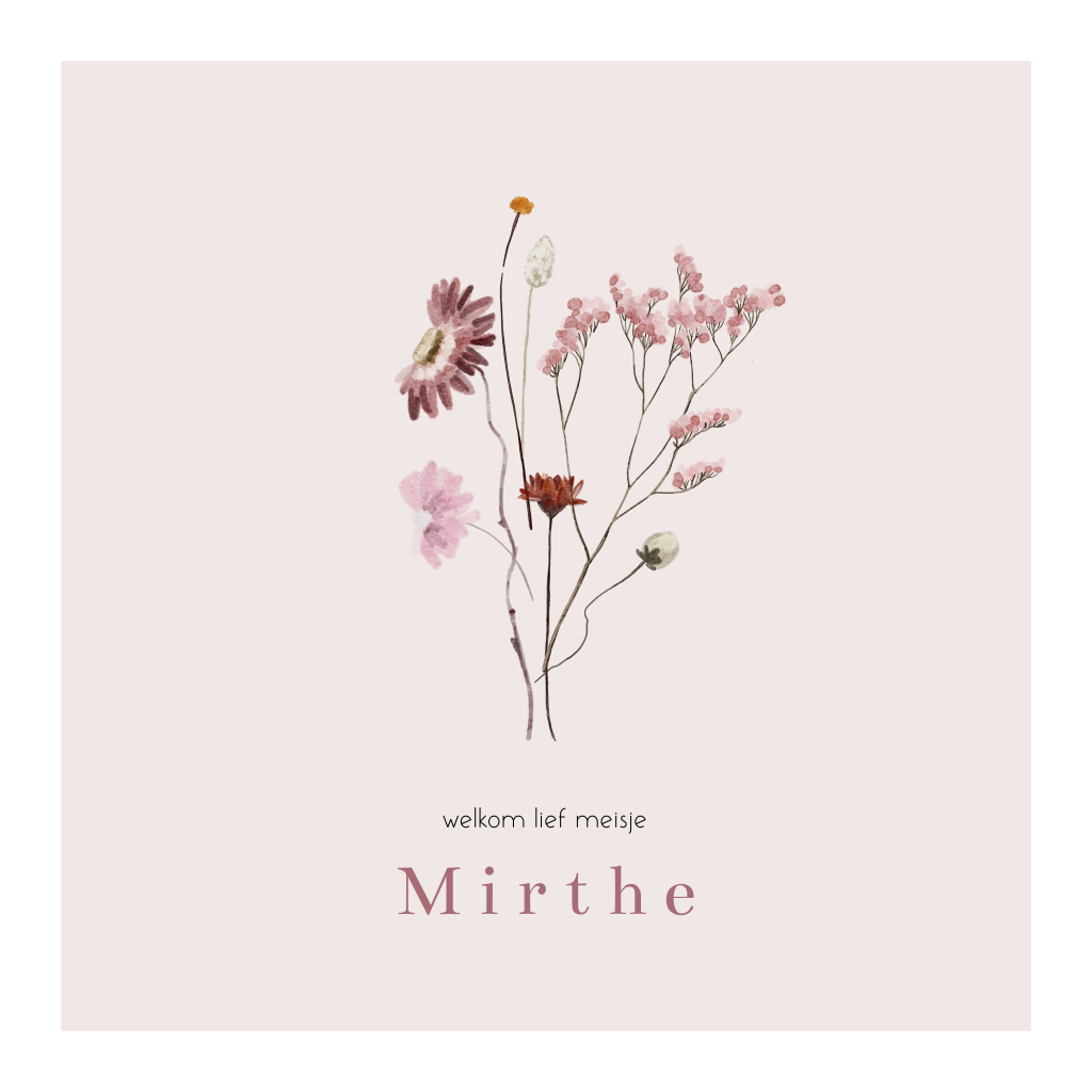 Lief geboortekaartje voor een meisje met boeket van roze wilde bloemen. Pas dit kaartje zelf aan in onze handige editor. Bij de illustraties staat een map met 'Bloemen wild waarmee je dit boekt kunt uitbreiden.