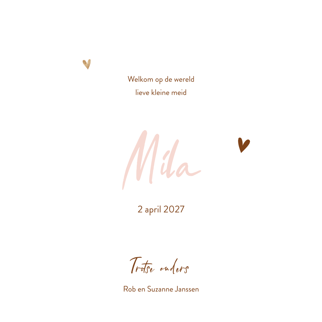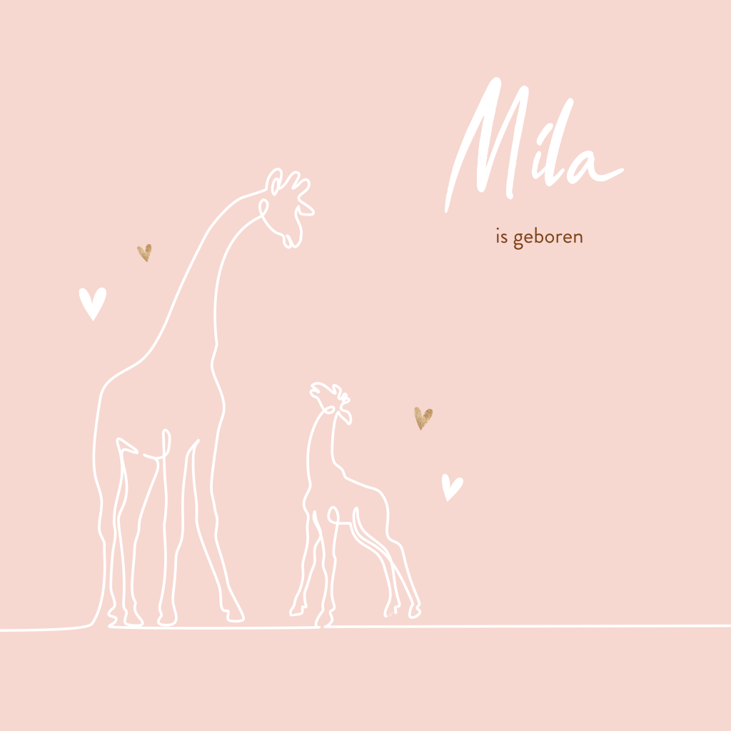 Dit lieve geboortekaartje is perfect voor liefhebbers van giraffen. Op de roze voorkant zie je een illustratie van twee giraffen in een hippe lijntekening. De kaart is versierd met verschillende hartjes. Pas de elementen naar wens aan om het geboortekaartje van jullie kleine meid nog persoonlijker te maken.