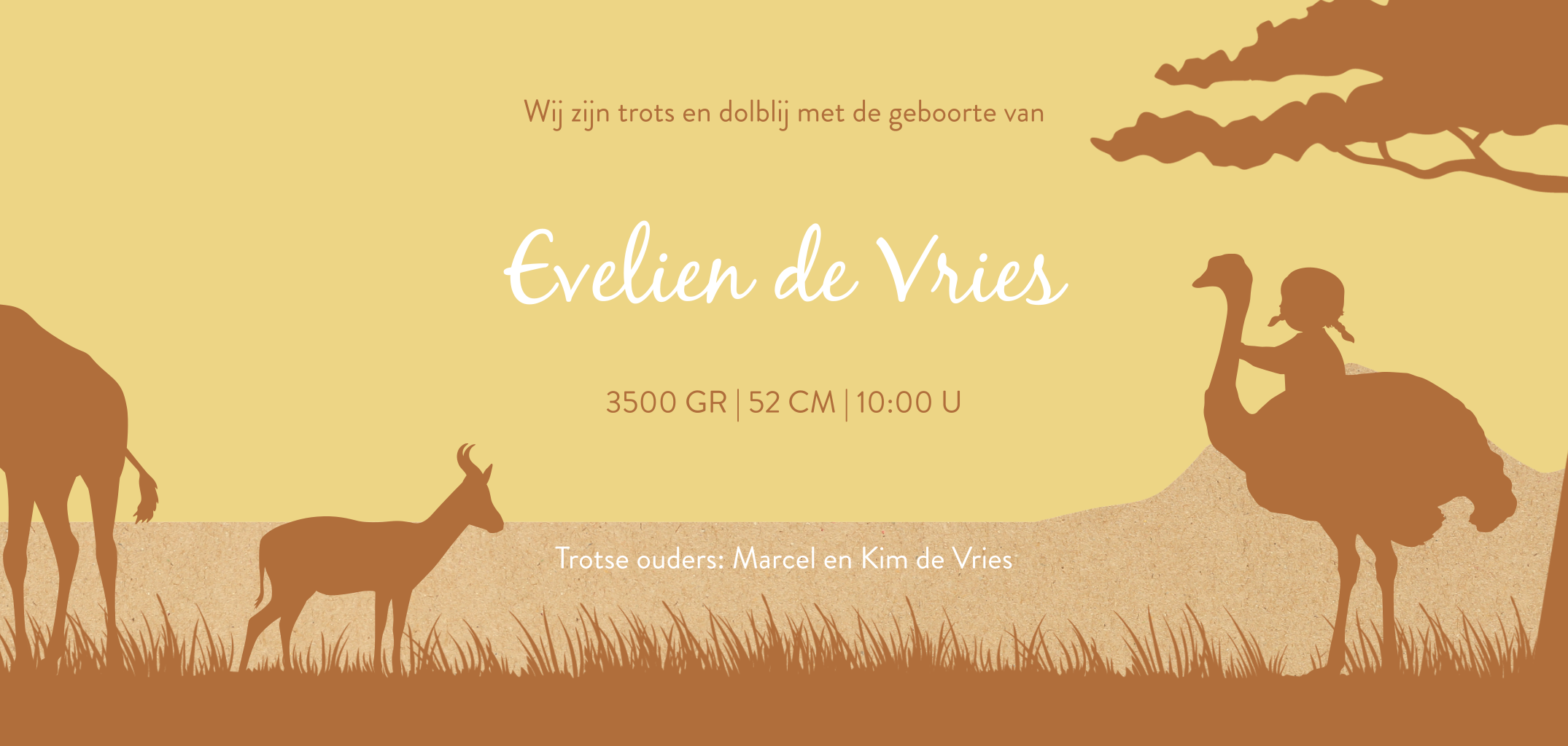 Kleurrijke geboortekaart met silhouet illustraties van allerlei dieren op de savanne. Je ziet een meisje op een olifant en een opkomende zon achter de bergen. De naam staat in het midden met een sierlijk en hip lettertype. Op de kaart zie je nog veel meer dieren als een struisvogel, giraf, leeuw en een bok. Een zomers geheel om de geboorte van je dochtertje mee aan te kondigen! Bestel een drukproef van het kaartje en beoordeel de kaart in het echt.