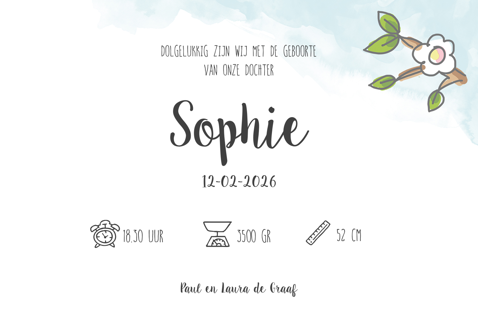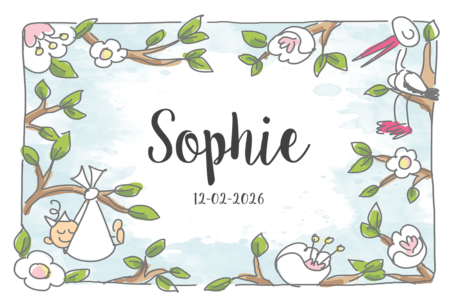 Schattig geboortekaartje voor een meisje met bloementakken en ooievaar. Dit lieve geboortekaartje heeft getekende takken en bloemen op de achtergrond. Ook is er een getekende ooievaar en baby te zien. De kleuren op de kaart zijn erg zacht en hebben een watercolor effect. De teksten zijn gemakkelijk aan te passen in onze ontwerptool.
