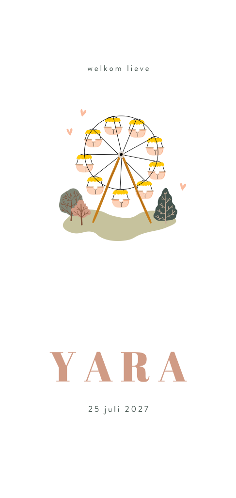 Is er een klein meisje op komst? Van harte gefeliciteerd! Om haar geboorte aan te kondigen ben je natuurlijk op zoek naar een lief geboortekaartje. Misschien is dit langwerpige kaartje met een geïllustreerd reuzenrad dan iets voor jou! Dit roze reuzenrad komt ook aan de achterkant terug, samen met wat boompjes in een vrolijk landschapje. Bestel een proefdruk om te zien hoe dit geboortekaartje er gedrukt uit komt te zien.