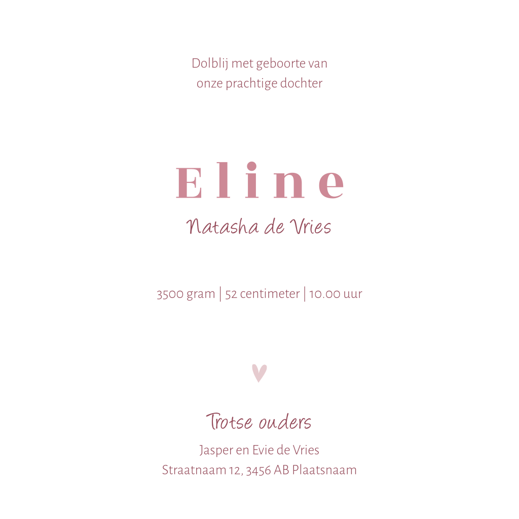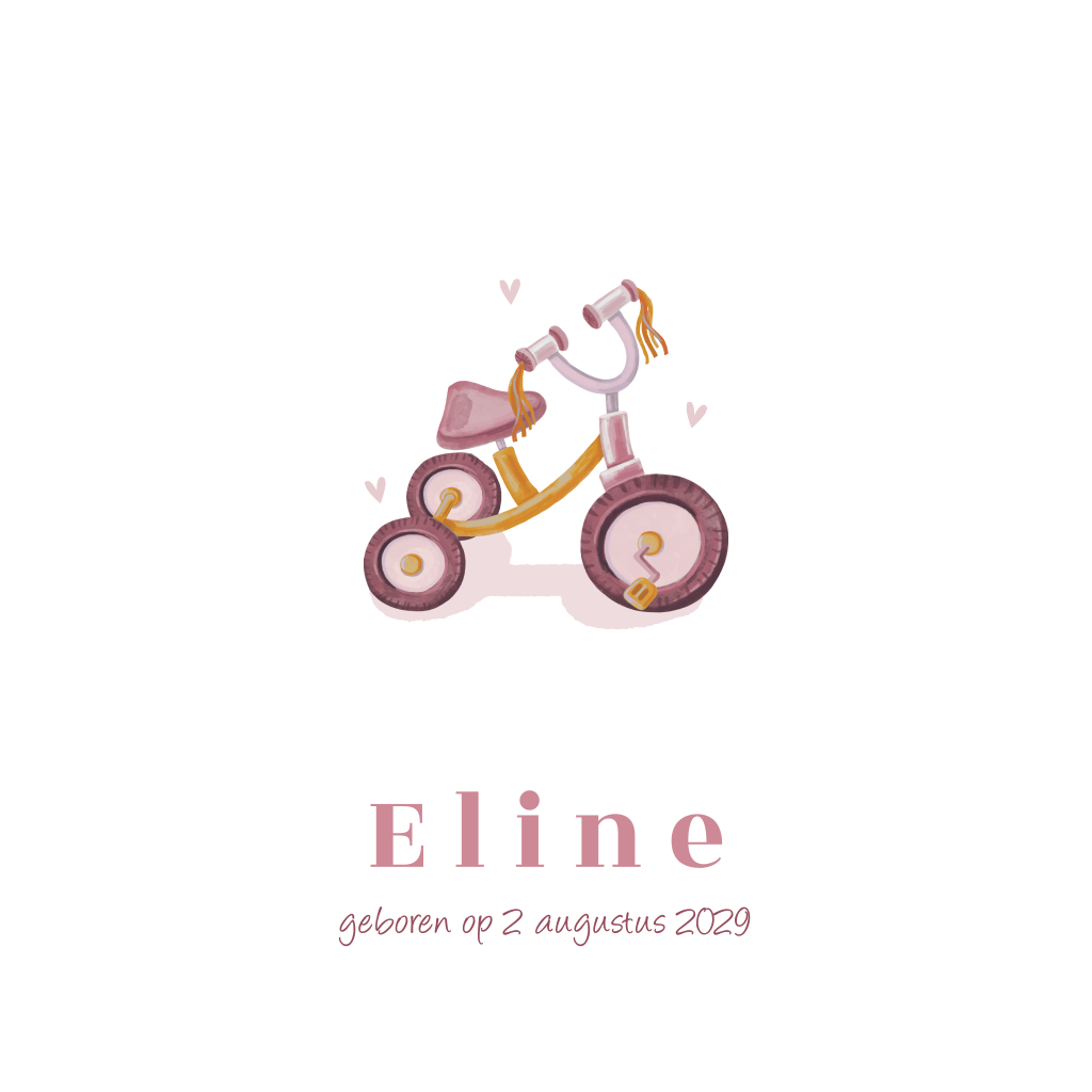 Lief geboortekaartje met roze driewielertje voor een klein meisje. Het fietsje kan als symbool staan voor het mooie avontuur waar jullie samen aan gaan beginnen! Aan de binnenzijde is ruimte voor een foto van je pasgeboren dochtertje. Pas dit kaartje helemaal aan naar eigen wens met behulp van onze handige editor. Bestel een proefdruk om dit witte geboortekaartje in het echt te kunnen bewonderen.
