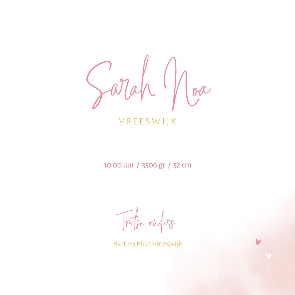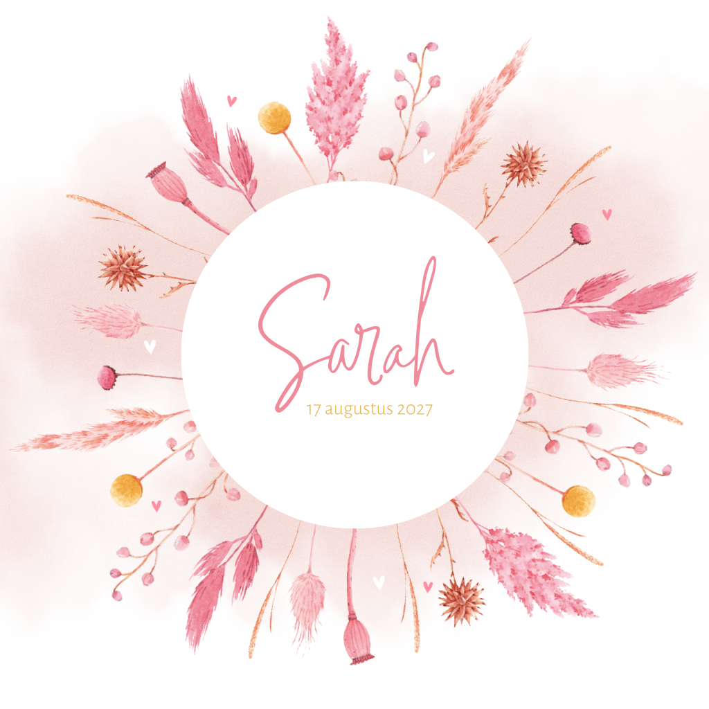 Op zoek naar een trendy geboortekaartje? Ga voor dit kleurrijke en vrolijke ontwerp met gele en roze droogbloemen. Een lief geboortekaartje om de komst van je dochter aan te kondigen. Pas eventueel de lettertypes aan of voeg zelf meer afbeeldingen toe met onze handige ontwerptool. Bestel een drukproef om dit kaartje in het echt te bewonderen.