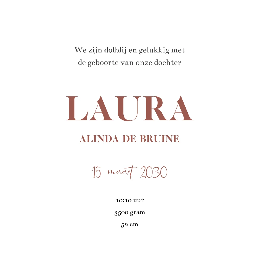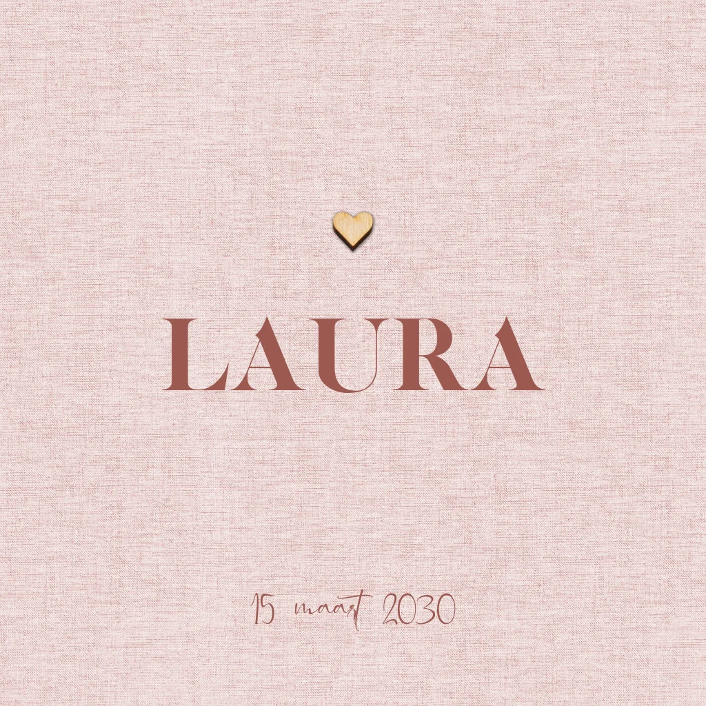 Dit vierkante, dubbele geboortekaartje heeft een zachte, roze linnenlook en is afgewerkt met een echt houten hartje op de voorzijde. Je kunt het ontwerp volledig aanpassen in de online editor: tekst, lettertypes en indeling zijn eenvoudig te bewerken. De binnenzijde biedt voldoende ruimte voor alle geboortegegevens.