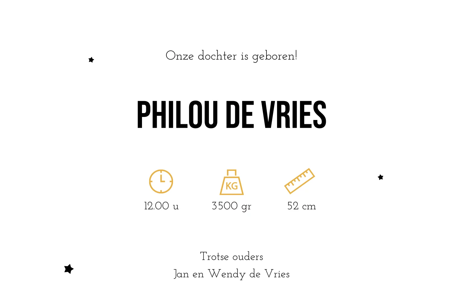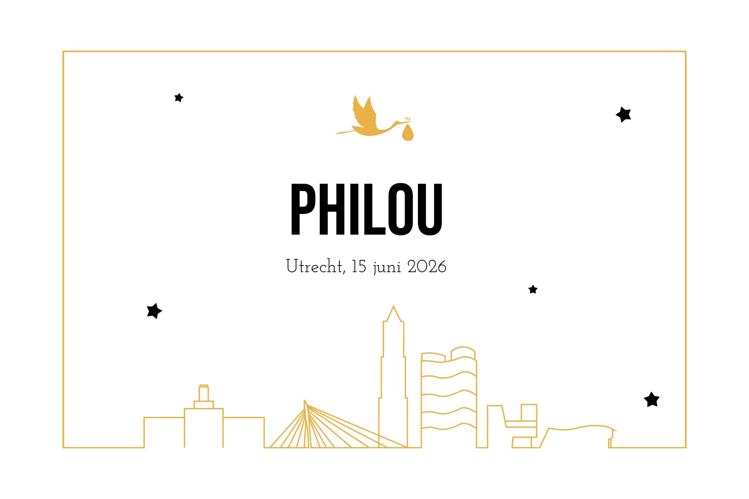 Stoer geboortekaartje voor een meisje met een gele skyline van Utrecht. De skyline bestaat uit onder andere de Domtoren, Utrecht Centraal Station, de Rabotoren, de Prins Clausbrug, de Inktpot en het stadskantoor. Boven de gebouwen vliegt een ooievaar. Aan de binnenkant is er bovenin ruimte overgelaten voor bijvoorbeeld een mooi gedichtje. Is geel niet jouw kleur? Pas deze dan gemakkelijk aan in onze handige editor en bestel een proefdruk.
