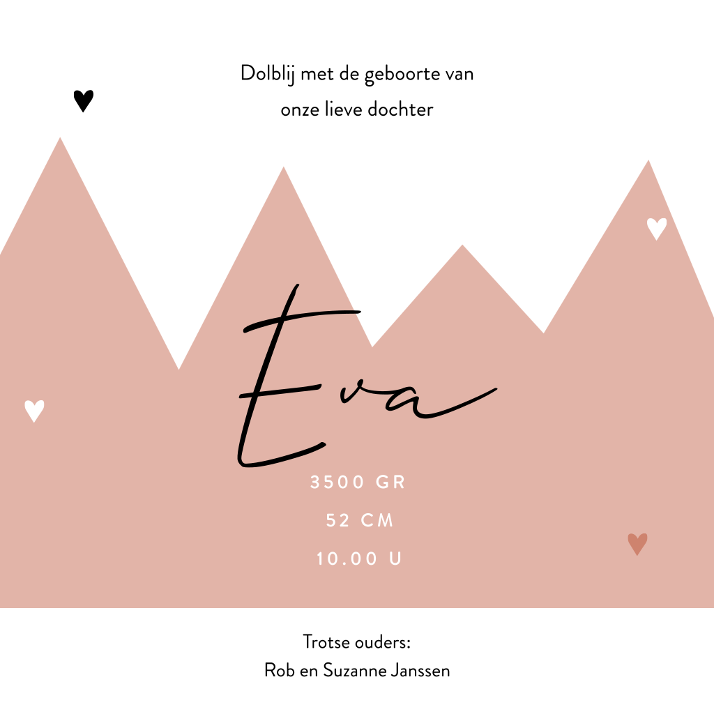 Kondig de komst van je kindje aan met dit stoere geboortekaartje met grafische bergen, tipi en hartjes. De bergen hebben een trendy terracotta kleur, maar deze kun je ook naar eigen wens aanpassen. Verander eventueel ook de lettertypes in onze handige ontwerptool.