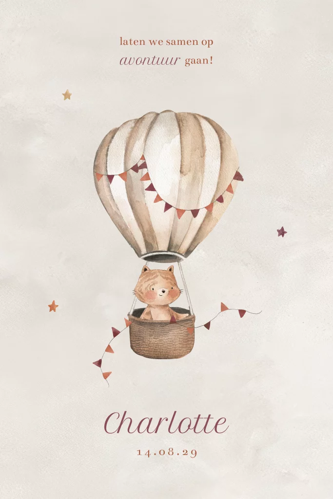 Mooi met waterverf geschilderd geboortekaartje met tijgertje in een luchtballon. Aan de luchtballon hangen slingers in oranje en donkerpaars. Op de achterzijde van dit kaartje kun je alle info over je pasgeboren dochter plaatsen. Hier staat nog een kleine illustratie van de tijger met een lila ballon. Pas de kaart naar wens aan.