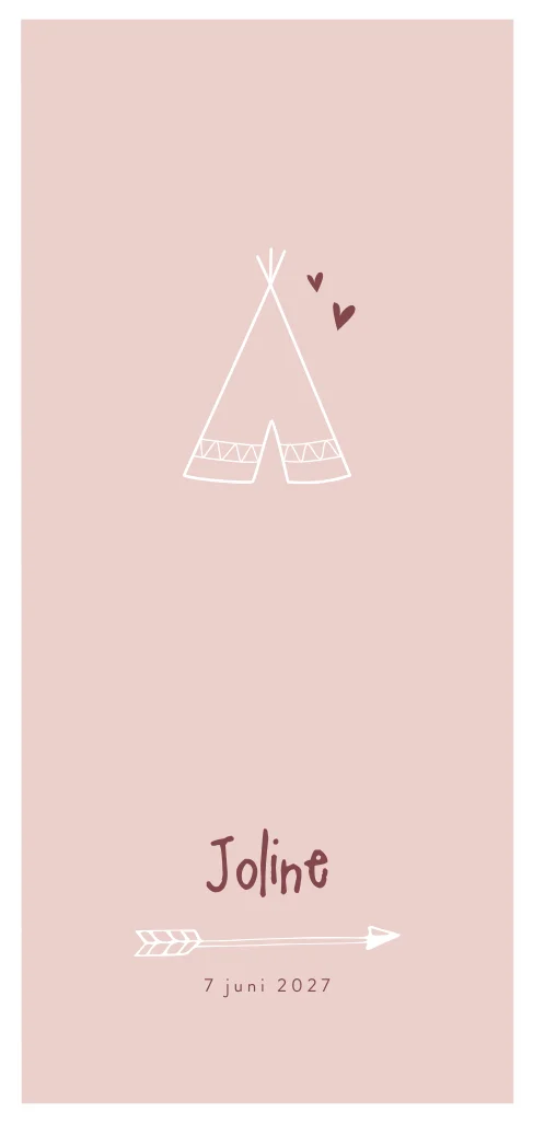 Lief, langwerpig geboortekaartje met getekende tipi voor een meisje. Helemaal fan van de bohemian trend? Dan is dit hippe kaartje wat voor jou! Op het ontwerp zie je een getekende tipi en een pijltje. Alle kleuren kan je naar wens aanpassen om het ontwerp helemaal eigen te maken. Is het ontwerp naar wens? Bestel dan een proefdruk om de kaart in het echt te bewonderen.
