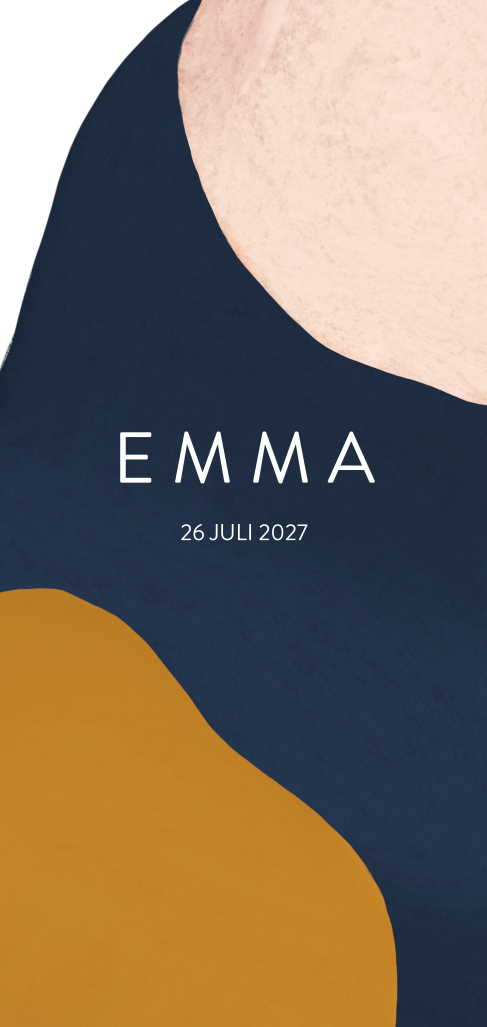 Staand geboortekaartje met abstracte vlekken vlekken in de kleuren donkerblauw, roestbruin en roze. Kondig de geboorte van jouw dochter aan met dit hippe geboortekaartje! Pas zelf de teksten aan en bestel een drukproef.