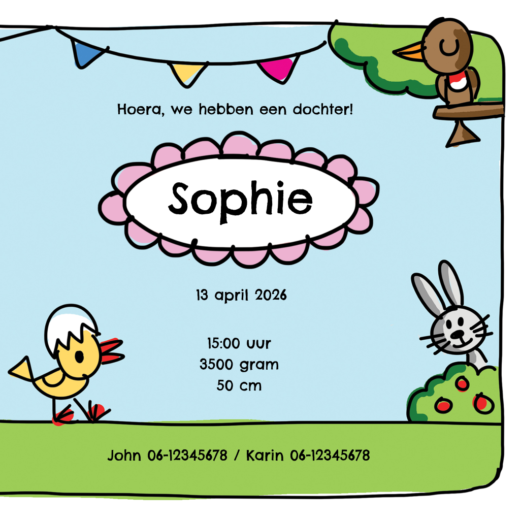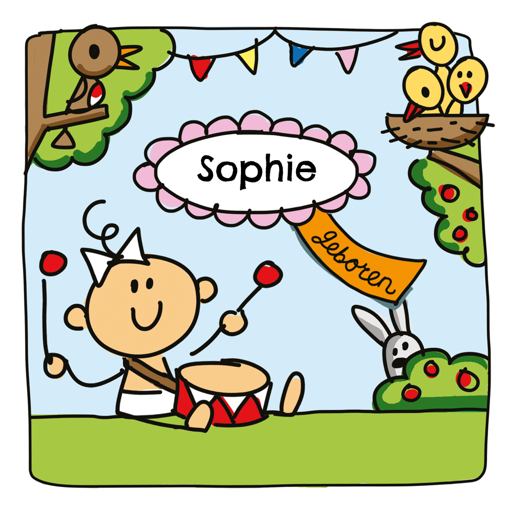 Ben je op zoek naar een vrolijk lente geboortekaartje? Dan is dit getekend geboortekaartje met baby meisje die met een trommel speelt superleuk. Zij zit in het bos tussen de bomen waar verschillende dieren op te zien zijn. Er zit een konijntje tussen de struiken en op hoog in de boom zie je een vogelnestje en een vogel op een tak. Tussen de bomen hangt een kleurrijke slinger.