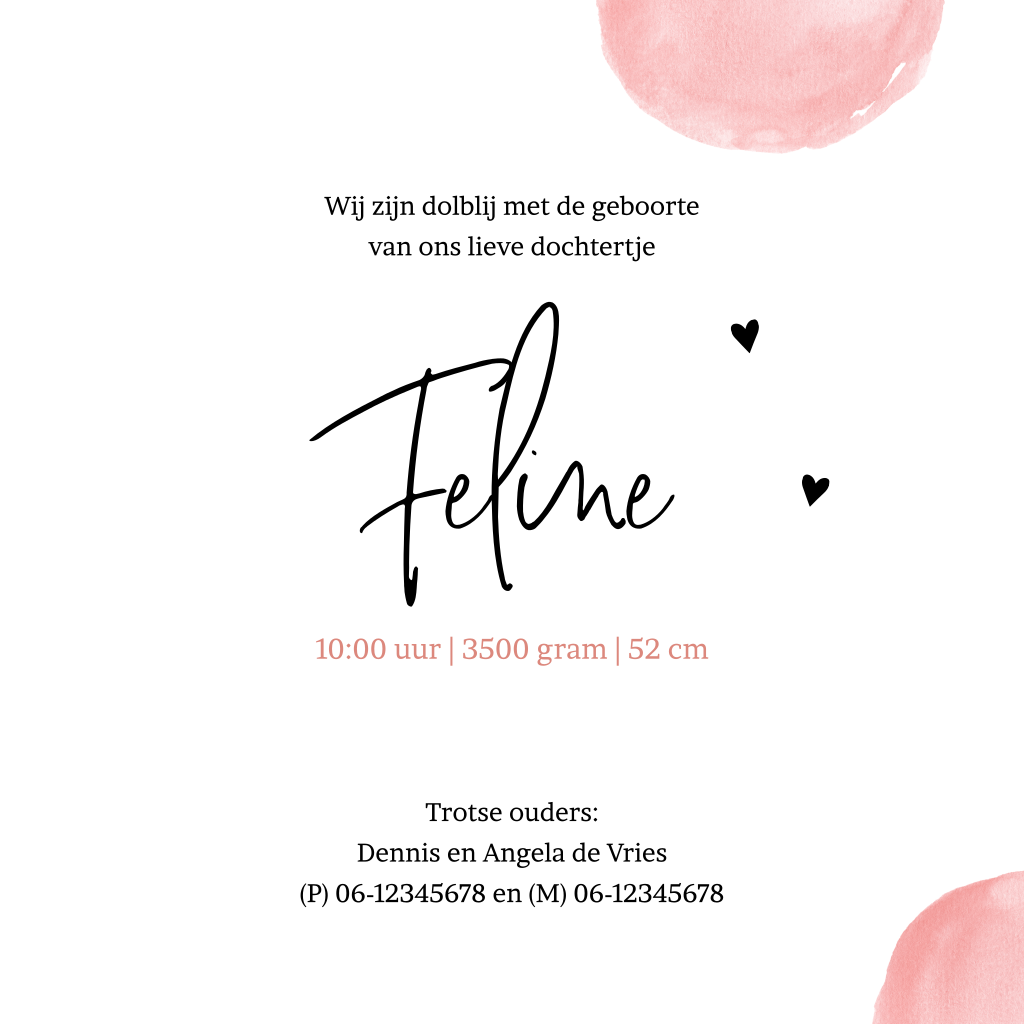 Lief geboortekaartje voor een meisje met roze waterverf en twee hertjes. De kaart is versierd met kleine hartjes. Met een vlot lettertype staat de naam van je dochter voorop de kaart. In de kaart is ruimte voor een mooie oneliner en alle geboortegegevens.