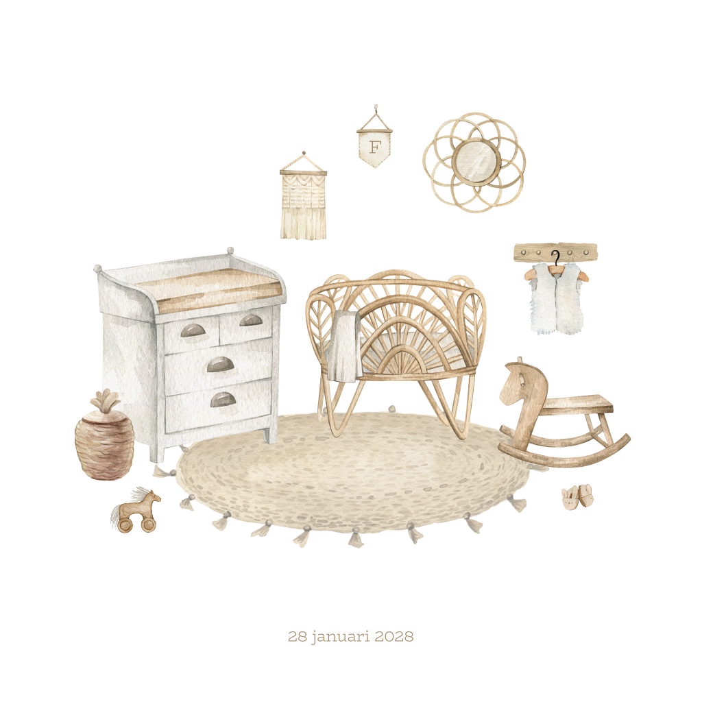 Stijlvol geboortekaartje met waterverf babykamertje en roségouden foliedruk. Met de afbeeldingen in de map 'Waterverf babykamer' kun je zelf dit kamertje aanpassen naar je eigen smaak. De foliedruk naam maakt dit ontwerp helemaal af. Aan de binnenzijde is er ruimte voor een lief gedichtje.