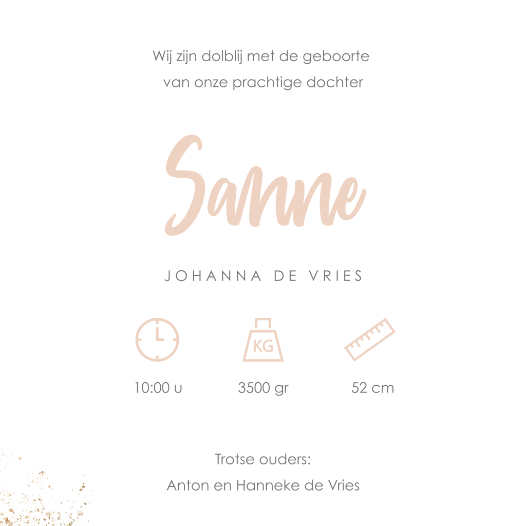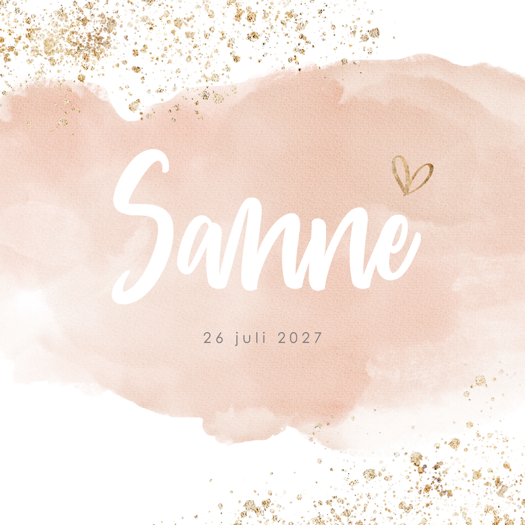 Mooi geboortekaartje met zachtroze waterverf en goudkleurige spetters. Met een hip lettertype staat de naam van je dochtertje voorop de kaart. De kaart is aangekleed met goudkleurige hartjes. In de kaartje kun je onder de iconen de geboortegegevens kwijt.
