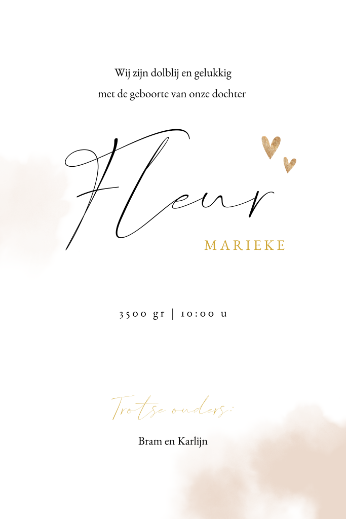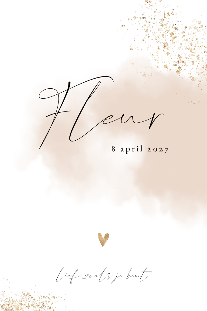 Hip geboortekaartje met een zachte, roze waterverf vlekken op de achtergrond. De sierlijke lettertypes en goudkleurige details geven de kaart een stijlvolle uitstraling. Deze kaart kan geheel naar wens personaliseren door de lettertypes en kleuren aan te passen. Als je daarmee klaar bent, kan je een proefdruk bestellen op een papiersoort naar keuze om de kaart in het echt te bekijken.