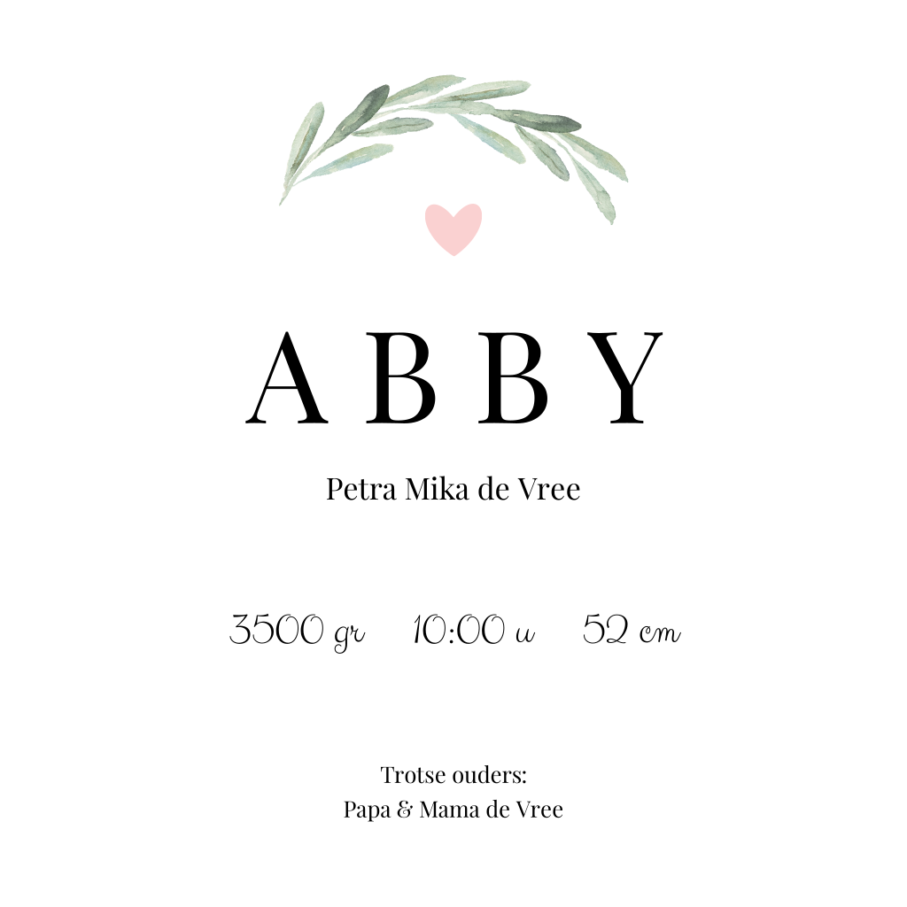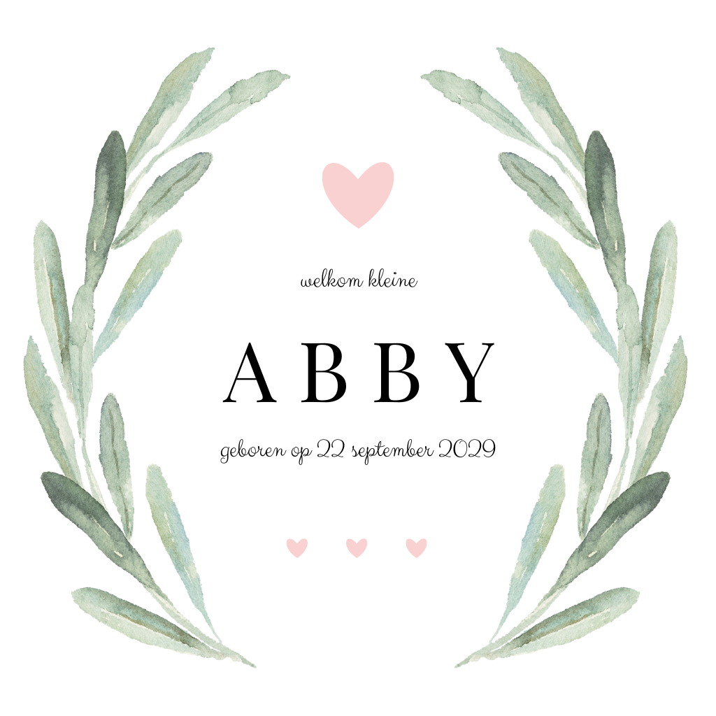 Geboortekaartje met bladeren en roze hartje