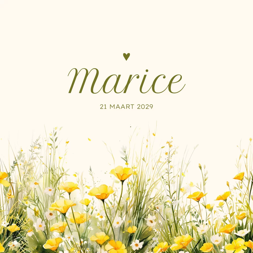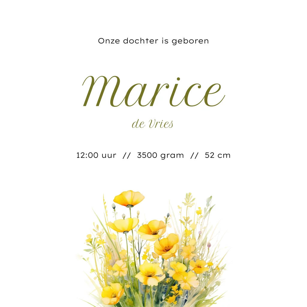 Verwelkom de lente en de geboorte van jouw dochter met een stralend geboortekaartje, versierd met gele boterbloemetjes! Maak het nog persoonlijker door het zelf aan te passen met onze handige online editor. En als alles perfect is, vraag dan gemakkelijk een drukproef aan om er zeker van te zijn dat het resultaat helemaal naar jouw wens is.