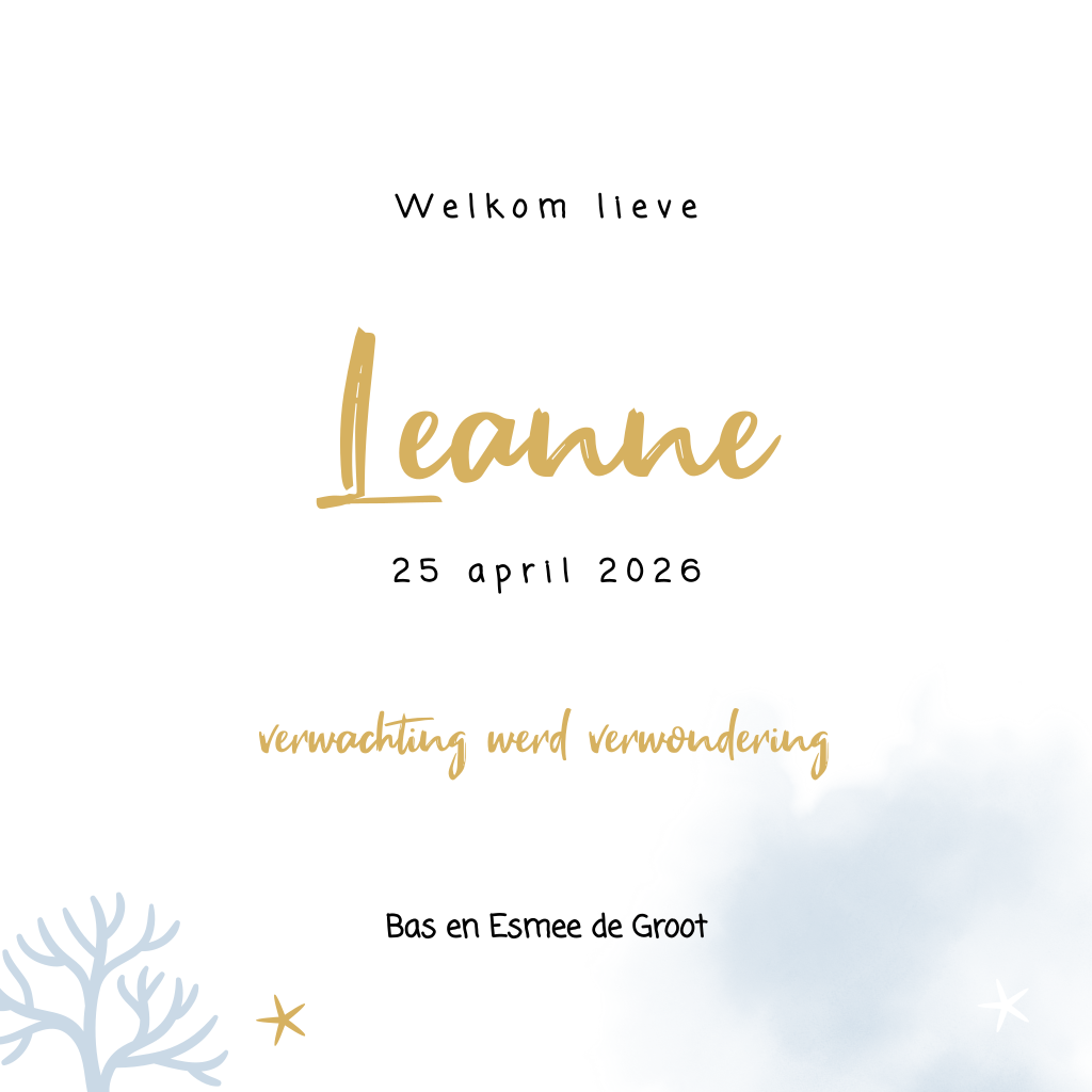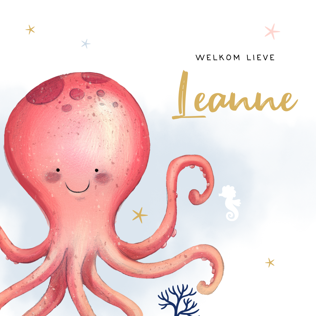 Geboortekaartje voor een meisje met roze octopus en zeesterren, zeepaardje en koraal. Op de voorkant zie je een leuke illustratie van een octopus in koraalroze aquarel. De achtergrond heeft een lichtblauwe waterverf vlek. De kaart is versierd met sterren en een lief zeepaardje. De naam staat met een speels lettertype op de voorzijde van de kaart. Bestel je de kaart op papiersoort linnen, dan lijkt de waterverf nog realistischer.