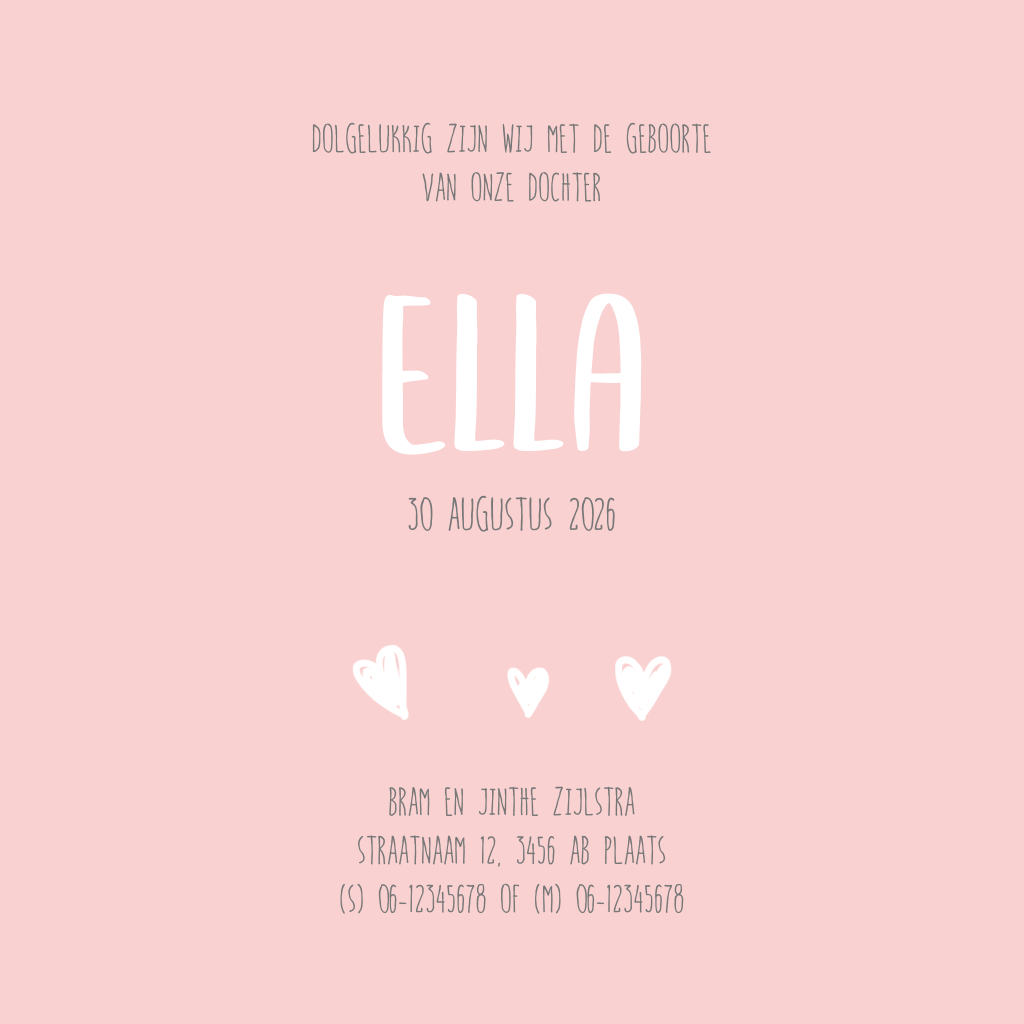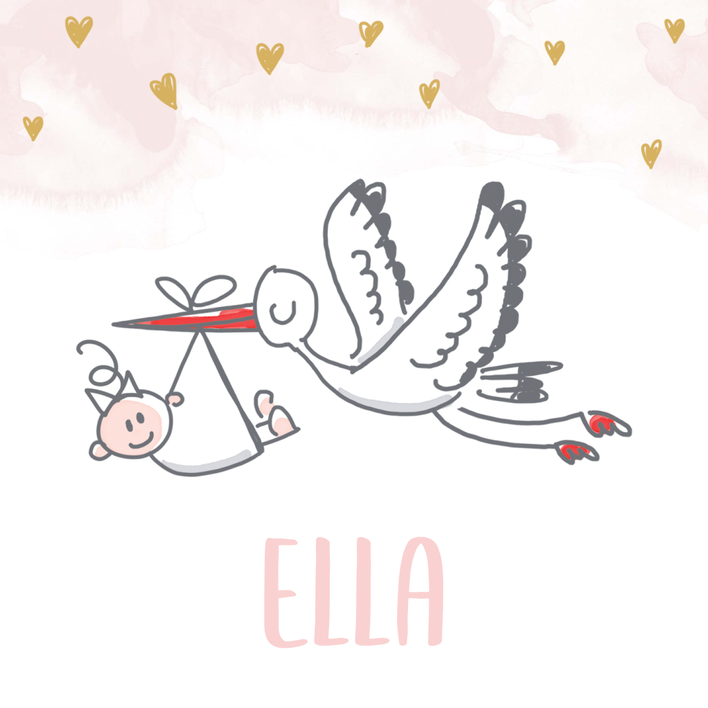 Zachtroze geboortekaartje ooievaar met baby meisje. Dit geboortekaartje is lief door de zachtroze kleur en hip door de gouden accenten. Op de voorzijde is een ooievaar te zien met een baby meisje in de knapzak, erg leuk om de naam van je dochter een speels lettertype mee te geven. De teksten zijn gemakkelijk aan te passen in onze ontwerptool.