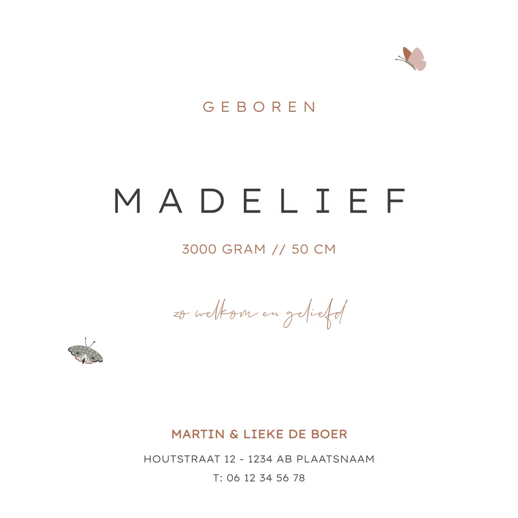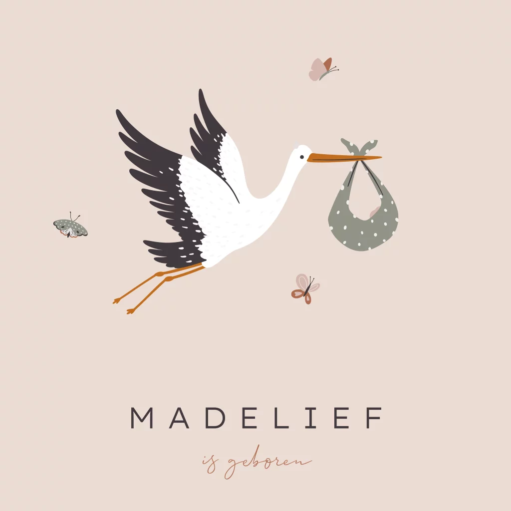 Een lieflijk geboortekaartje voor een meisje, met een vriendelijke ooievaar die een kindje in een groene knapzak draagt. Binnenin een wiegje met een zachtroze dekentje en feestelijke ballonnen zwevend in de lucht, te midden van dartelende vlinders. Personaliseer het kaartje eenvoudig met onze editor en bestel een proefdruk.