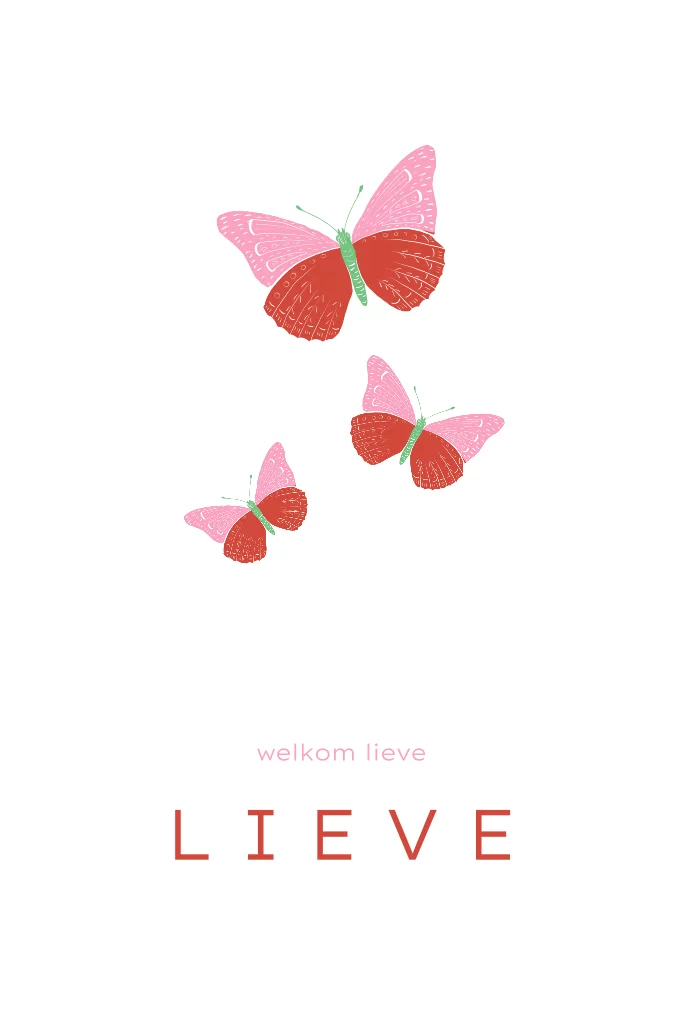 Vrolijk geboortekaartje met drie roze vlinders in opvallende colorblocking-stijl. De felle roodroze kleurcombinaties geven het ontwerp een eigentijdse, grafische uitstraling. Minimalistisch maar speels, perfect voor ouders die houden van kleur en eenvoud in één ontwerp. Aanpasbaar in onze editor.