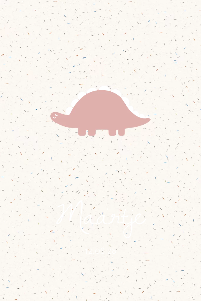 Lief geboortekaartje met roze dino, goudfolie en papiertextuur als achtergrond. Een vrolijk geboortekaartje voor jouw pasgeboren dochtertje! Pas dit ontwerp eventueel zelf verder aan in onze handige editor.