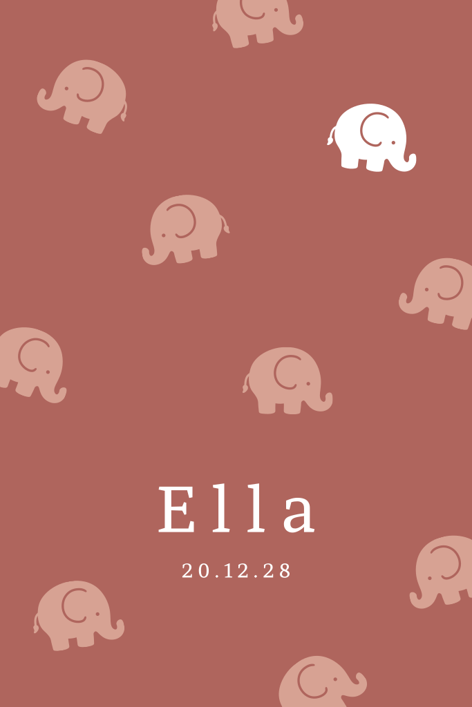 Roze geboortekaartje met patroon van grafische olifantjes. De naam van je dochtertje wordt gedrukt in prachtig roségoudfolie, net als één van de olifantjes. Op de achterkant is ruimte voor de geboortegegevens. Liever andere kleuren? Pas dit kaartje naar eigen wens aan in onze editor en bestel een proefdrukje.