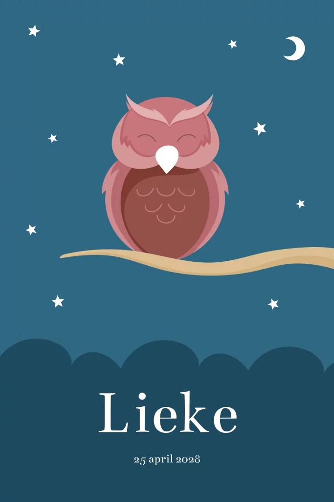 Een klein roze uiltje dommelt tevreden in onder een hemel vol sterren. Met haar zachte roze tinten en glanzende roségoudfolie is dit geboortekaartje perfect voor de aankondiging van jullie dochter.