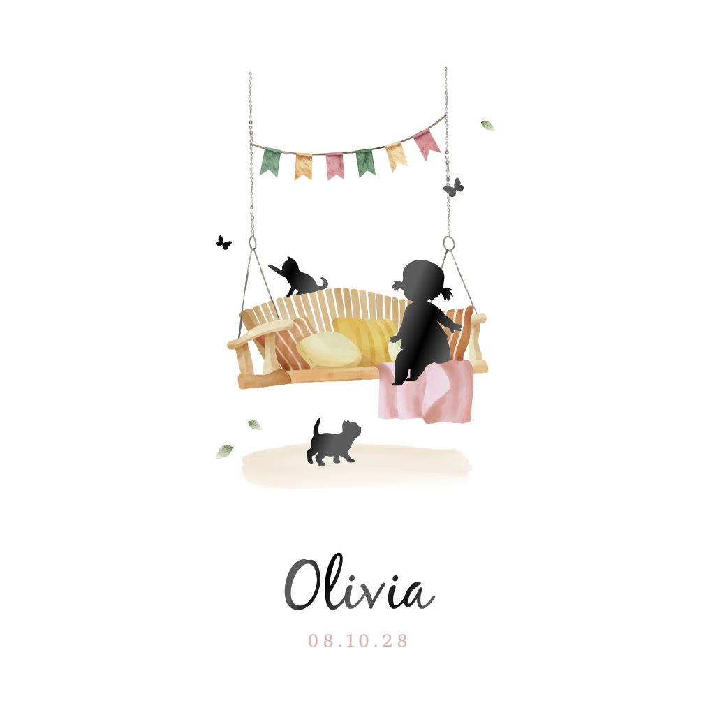 Lief geboortekaartje met hoogglans silhouetjes en waterverf illustratie. Op een geschilderd bankje zit een klein meisje, samen met twee lieve kittens. Kondig de geboorte van jouw dochtertje aan met dit leuke ontwerp! De hoogglans silhouetjes kun je eventueel van kleur veranderen. Of wat denk je van goud- of koperfolie in plaats van hoogglans? Maak dit kaartje helemaal naar je eigen zin in onze handige editor en bestel een proefdruk.