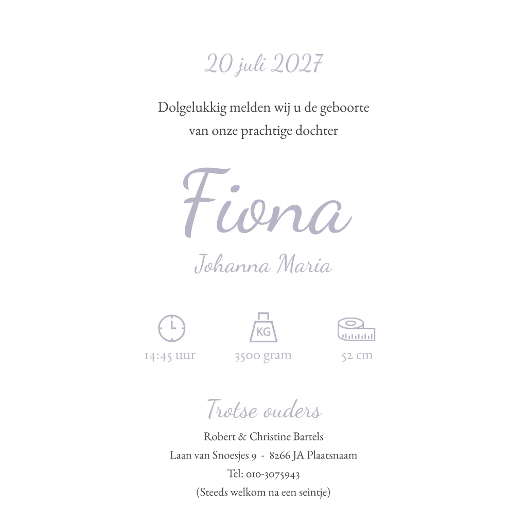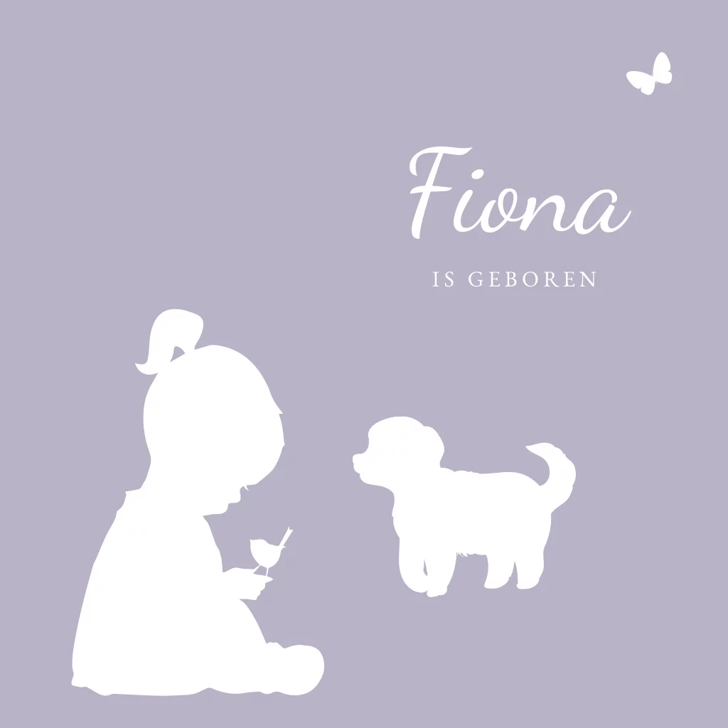 Een klein meisje bewondert een vogeltje, een lief hondje kijkt nieuwsgierig toe. Een lila geboortekaartje met silhouetjes, een tijdloos en lieflijk kaartje om de komst van je dochtertje mee aan te kondigen. Pas de achtergrondkleur eenvoudig aan in onze editor en bestel een proefdruk om te zien hoe dit kaartje er in het echt uit komt te zien.