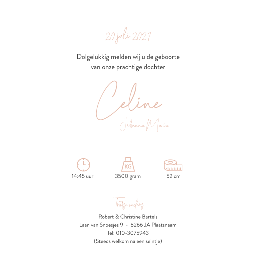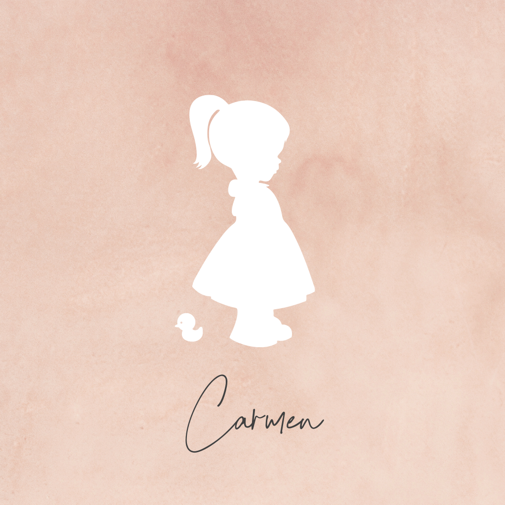 Modern geboortekaartje met zachtroze waterverf achtergrond en klein meisje in wit silhouet op de voorzijde.