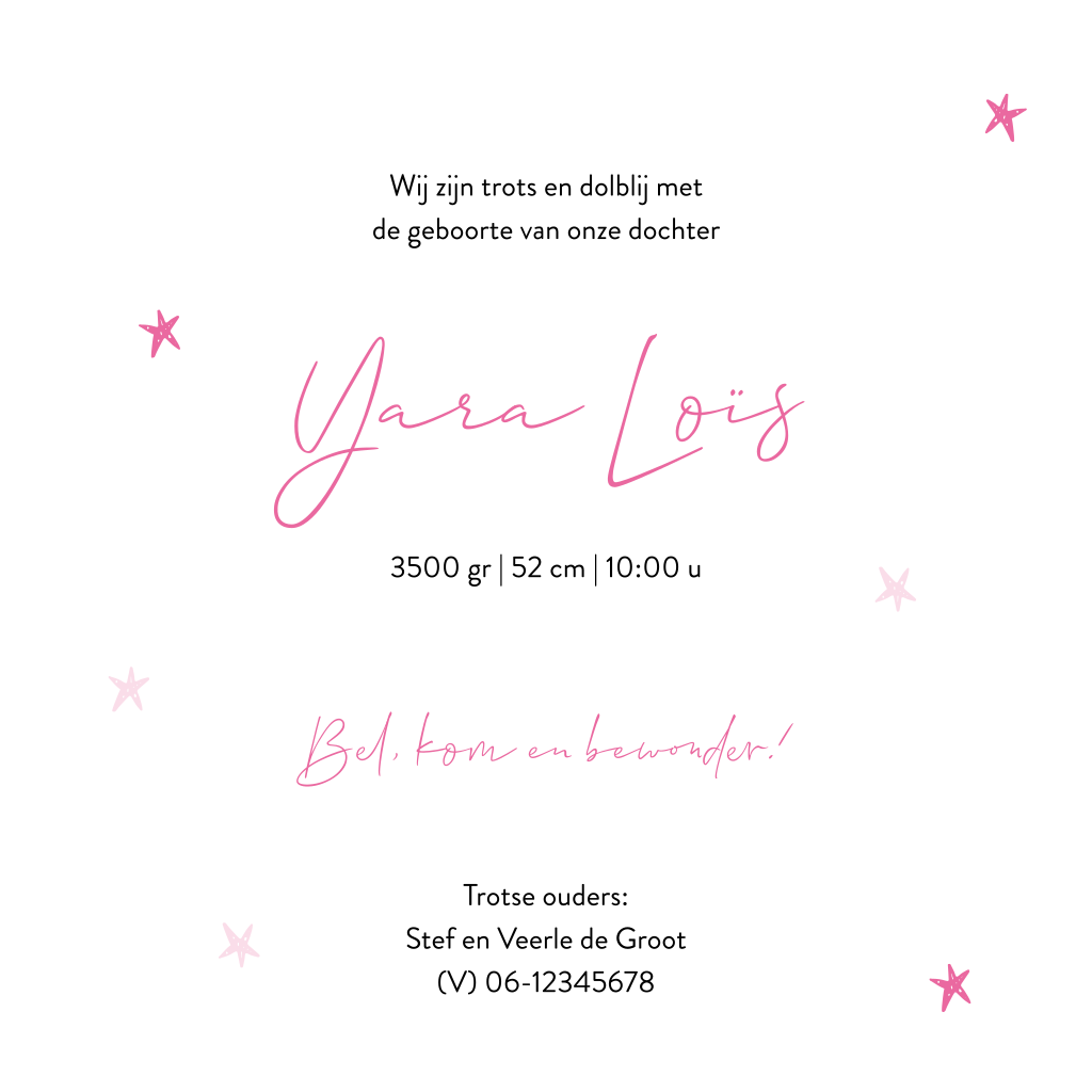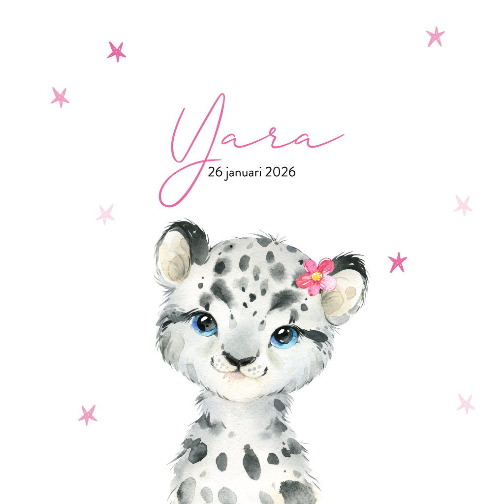 Geboortekaartje met sneeuwluipaard en roze sterren