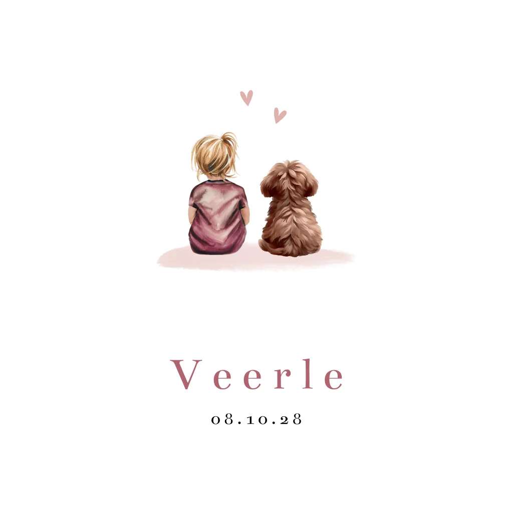 Wit geboortekaartje met waterverf meisje en hondje, die gezellig naast elkaar zitten. De naam van je dochter komt onder de waterverf illustratie te staan. Kies eventueel een ander hondje in onze ontwerptool, je vindt ze in de map 'Waterverf honden'. Zo maak je er echt een persoonlijk geboortekaartje van, extra leuk als je thuis een hondje hebt!