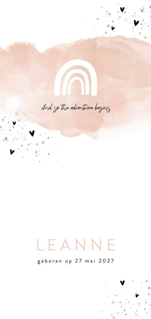 Op zoek naar een lief geboortekaartje voor je pasgeboren kleine meid? Kies dit hippe ontwerp met regenboog voor je dochter. Regenbogen zijn helemaal in en staan erg leuk op geboortekaartjes. De kaart is aangekleed met roze waterverf, zilveren spetters en hartjes. Bestel een proefdruk om het gedrukte resultaat te bekijken.
