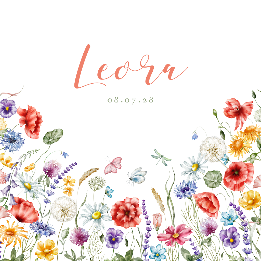 Prachtig geboortekaartje met wilde, zomerse bloemen in allerlei kleuren. De vlinders, bijtje en de libelle maken het geheel helemaal af! Een mooi kaartje om de komst van je zomerkindje mee aan te kondigen. De naam van de kleine komt in sierlijke letters voorop. Pas dit ontwerp zelf aan in onze editor en bestel een proefdruk.