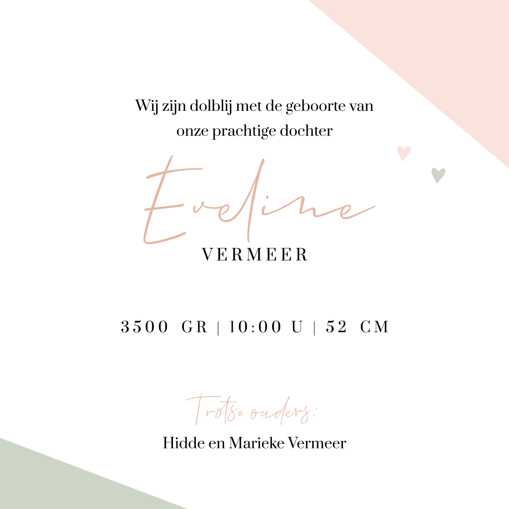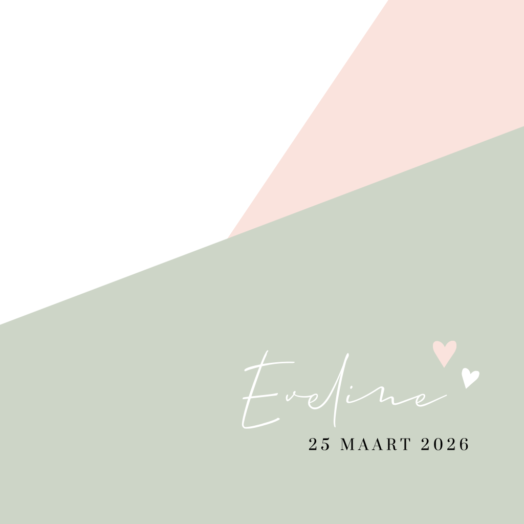 Geboortekaartje met groene en roze geometrische vlakken en hartjes. Stijlvol geboortekaartje met strakke geometrische vlakken op vierkant formaat. Dit hippe ontwerp heeft de naam van jouw pasgeboren meisje met een sierlijk lettertype groot op het kaartje. De hartjes maken het ontwerp helemaal af. Pas het ontwerp helemaal naar wens aan in de ontwerptool. Extra leuk, bevestig een labeltje aan de voorzijde van de kaart.