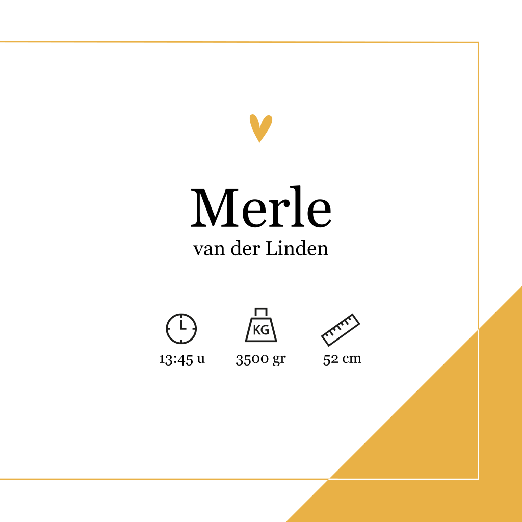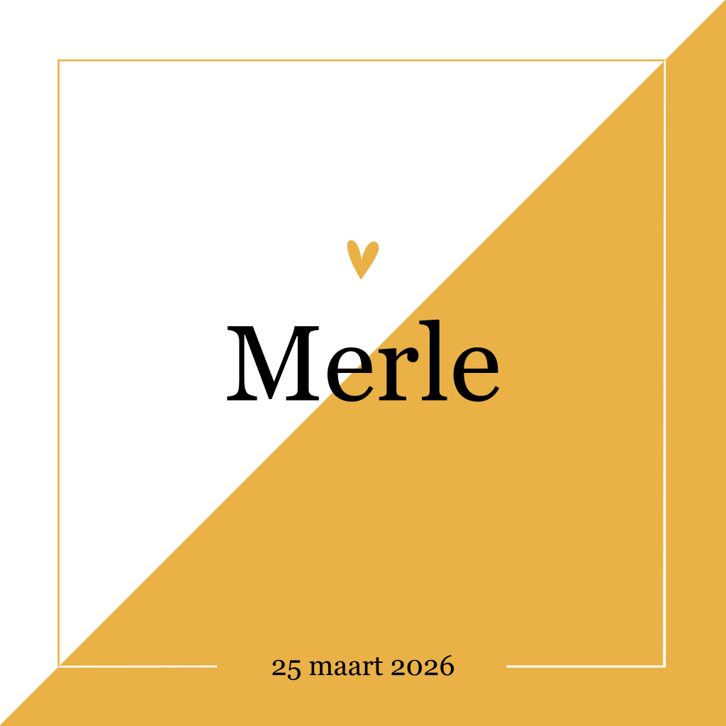 Geometrisch geboortekaartje met okergeel vlak en een hartje. Hip geometrisch geboortekaartje met schuine vlakken in okergele kleur. Daaromheen een kader met onderin de datum. Wil je liever een andere kleur? Je kunt de kleur eenvoudig in de ontwerptool aanpassen.