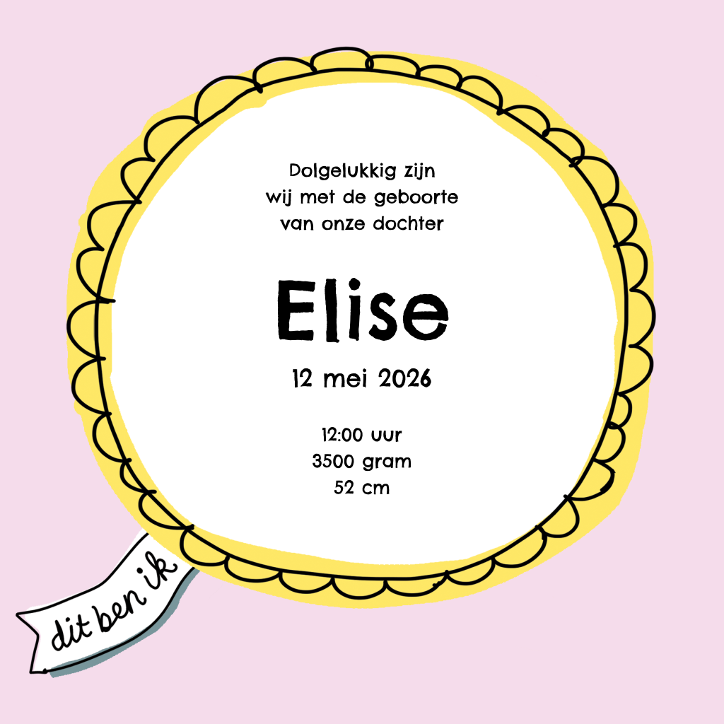Getekend geboortekaartje baby meisje met strikje met roze achtergrond. Zoek je een vrolijk geboortekaartje voor je kleine meid? Zoek dan niet verder, dit ontwerp heeft een tekening van een blij baby meisje op de voorzijde. Aan de binnenzijde zie je een rozet, met daarin alle geboortegegevens.
