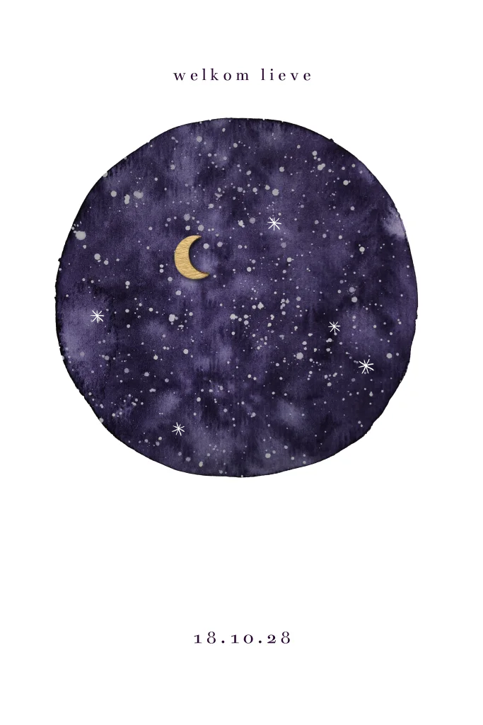 Klassiek geboortekaartje met paarse sterrenhemel en houten maantje. Het houten maantje kun je zelf op de paarse waterverf cirkel plakken, een deel van de sterretjes plus de naam van je dochtertje worden in goudfolie gedrukt. Pas dit kaartje zelf aan in onze editor.