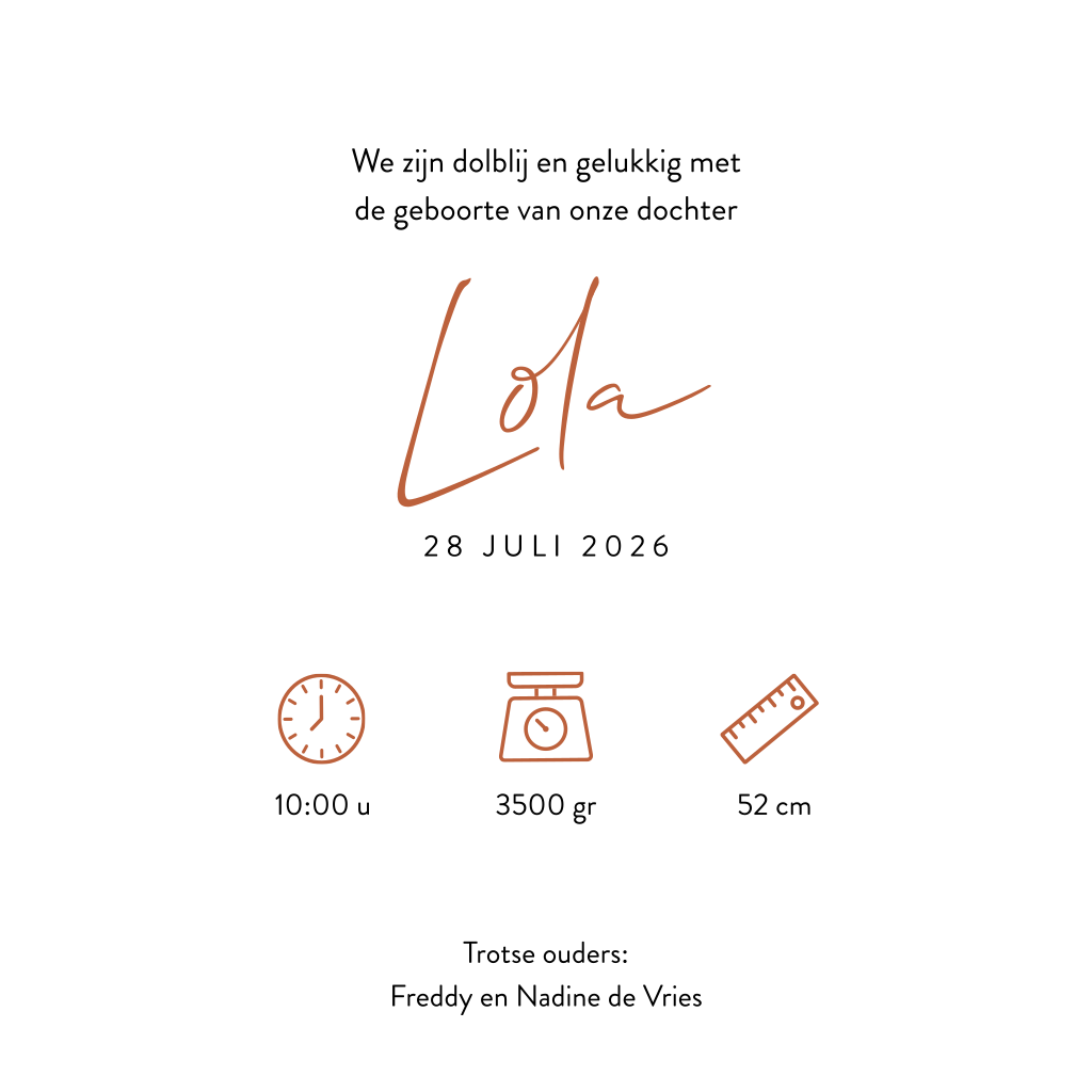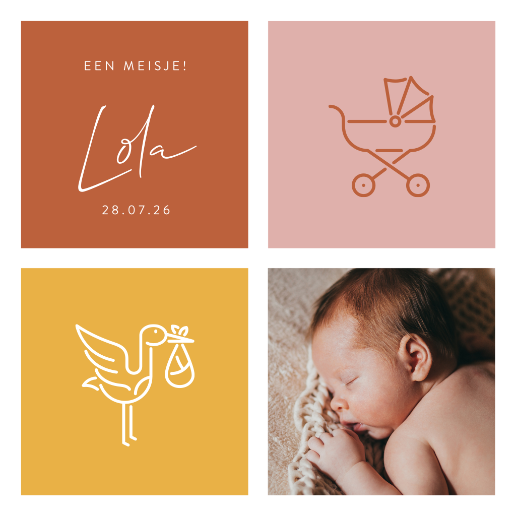 Op zoek naar een kleurrijk geboortekaartje om de geboorte van je dochtertje mee aan te kondigen? Ga dan voor dit grafische ontwerp met gekleurde vlakken, eenvoudige tekeningen en een fotokader. Plaats een lieve foto van je kindje voorop en kies een leuk gedichtje om aan de binnenzijde van de kaart te plaatsen. De roestbruine, okergele en oud roze kleuren maken dit tot een trendy ontwerp. Natuurlijk kun je de kleuren ook aanpassen naar je eigen smaak.