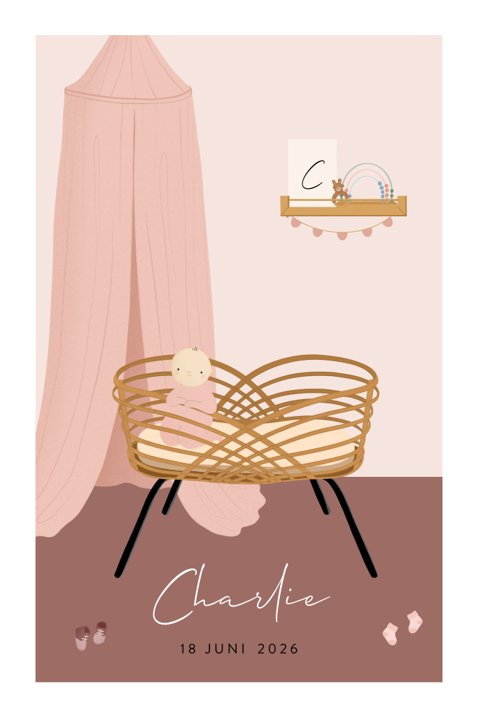 Roze geboortekaartje kinderkamer met rotan wiegje en baby meisje