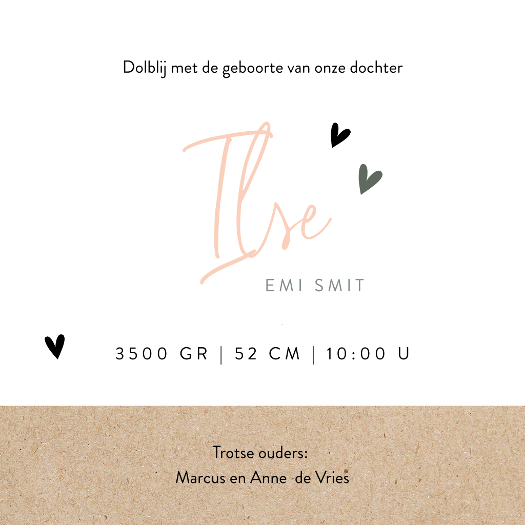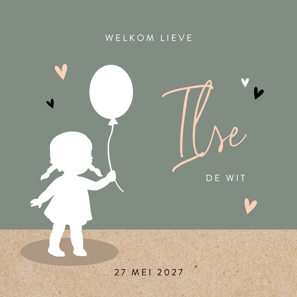 Vrolijk geboortekaartje met silhouet meisje met ballon en kleine hartjes. De groene achtergrondkleur is een trendy kleur, maar uiteraard kun je deze ook naar eigen smaak aanpassen. Aan de binnenkant is ruimte voor een gedichtje en alle geboortegegevens van je dochtertje.