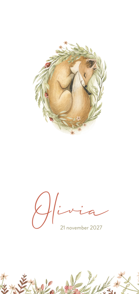 Langwerpig geboortekaartje met lief slapend vosje, takjes en bloemen. Dit enkele geboortekaartje is perfect voor het aankondigen van de geboorte van een herfstkindje! Op de voorzijde staat een tekening van een lief slapend vosje omringd door takjes en bloemen. Op de achterzijde komt het vosje terug en kun je alle info over je pasgeboren dochtertje plaatsen. Liever een ander lettertype? Pas dit kaartje eventueel aan in onze handige ontwerptool en bestel een proefdruk om het resultaat in het echt te kunnen bewonderen.