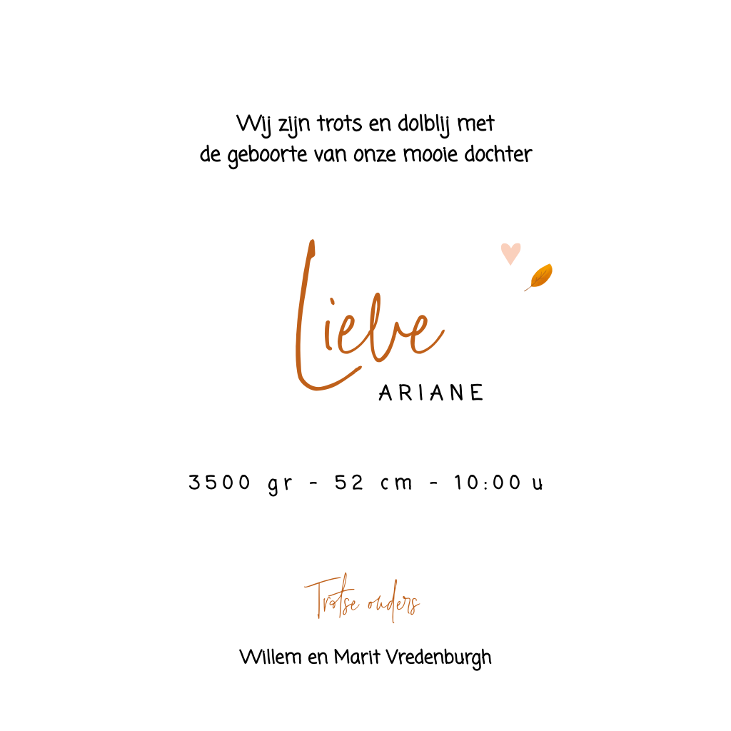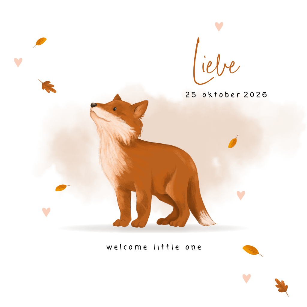 Herfst geboortekaartje met vosje en lichtroze waterverf. Vierkant geboortekaartje met een lieve illustratie op de voorzijde van een vosje. Rondom het vosje dwarrelen blaadjes. Het rose waterverf maakt het ontwerp helemaal af. Met een sierlijke en moderne letter staat de naam van je pasgeboren dochtertje groot op de kaart. In de kaart keert het vosje terug, dit keer slapend. Links is ruimte voor een gedichtje en rechts is ruimte voor alle geboortegegevens.
