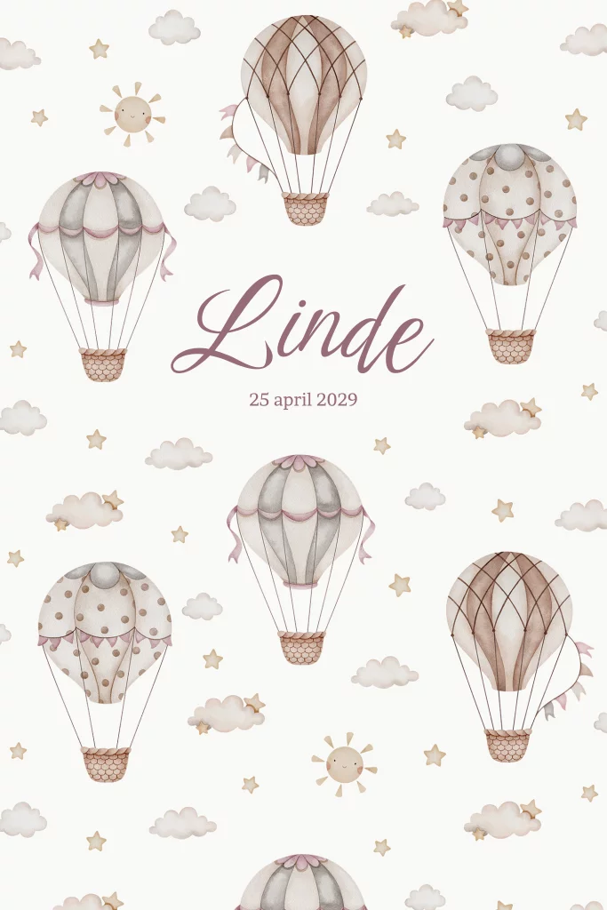 Leuk geboortekaartje met diverse luchtballonnen die rustig zweven tussen de wolken en twinkelende sterretjes. De zachte pastelkleuren en de stralende zon geven het kaartje een vrolijke en dromerige uitstraling. In het midden staat de naam en geboortedatum, perfect voor het vieren van een nieuw leven. Pas de kaart aan met de kaartenmaker.