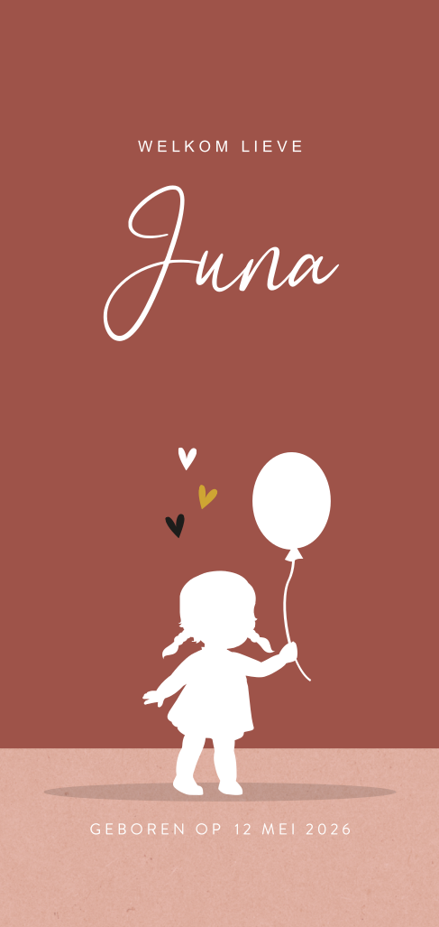 Silhouet geboortekaartje meisje met ballon en hartjes. De achtergrond is rozerood en onderin een roze kraft strook. Liefhebber van silhouetjes op geboortekaarten? Dan is dit een leuk geboortekaartje voor jouw pasgeboren dochter. Achterop keert het meisje terug in een karretje. Hier kun je de geboorte- en adresgegevens plaatsen.