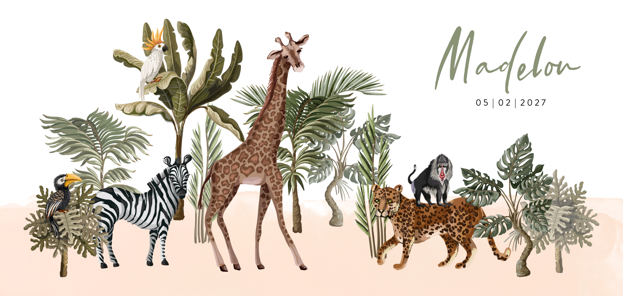 Dit jungle geboortekaartje voor een meisje staat vol wilde dieren als giraf, zebra, panter, baviaan en een kaketoe en is omgeven door tropische planten en bomen. Op de achterkant kun je de kaketoe op de naam van je pasgeboren dochtertje plaatsen. Liever een ander lettertype? In onze handige designtool kun je de kaart eventueel verder naar wens aanpassen.