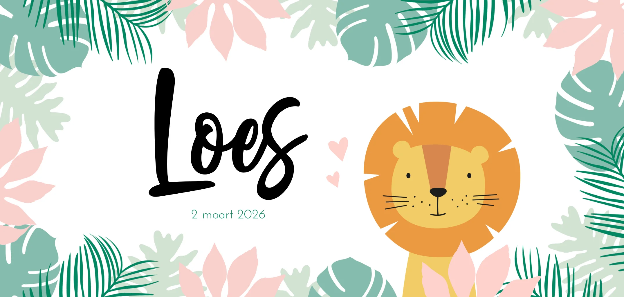 Dit schattige geboortekaartje heeft voorop een jungle in pastelkleuren met daarin een lief leeuwtje verstopt achter de struiken. De kaart is verder versiert met roze hartjes. Op de achterkant komen de tropische planten en het leeuwtje terug. Pas dit kaartje eventueel naar je eigen smaak aan in onze ontwerptool.