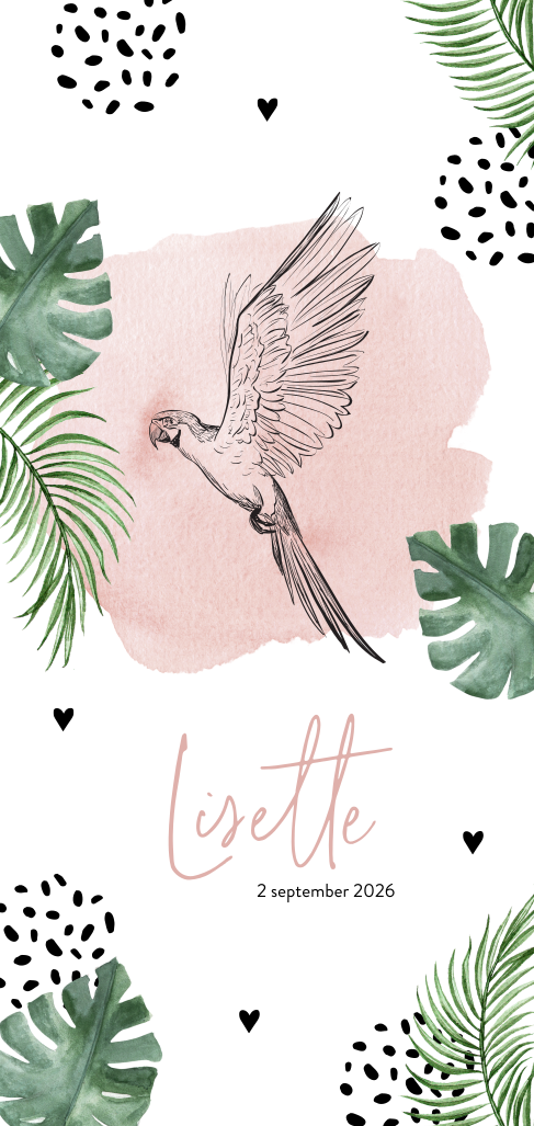 Tropische geboortekaartjes zijn trendy! Zo ook dit langwerpige kaartje met getekende papegaai, jungle bladeren en hartjes. De roze details en typografie maken dit tot een perfect geboortekaartje voor jouw pasgeboren dochtertje. Een stoer, maar toch lief design. Verplaats de illustraties, pas de kleuren aan of kies een ander lettertype in onze gebruiksvriendelijke ontwerptool om dit kaartje verder te personaliseren.