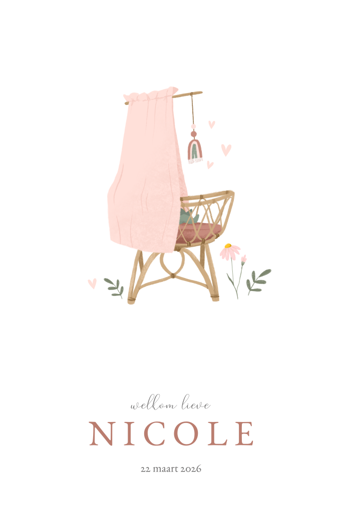Klassiek geboortekaartje met roze wieg met bloemetjes. Op zoek naar een klassiek geboortekaartje voor je pasgeboren dochtertje? Dit stijlvol getekende geboortekaartje is een perfecte keuze, klassiek en toch helemaal van deze tijd. In het midden zie je een roze wieg met daarin de baby. De naam staat met strakke en chique letters onderaan de kaart. Deze kun je helemaal naar wens aanpassen in de ontwerptool. Zo kun je de kleur veranderen en voor een ander font kiezen.