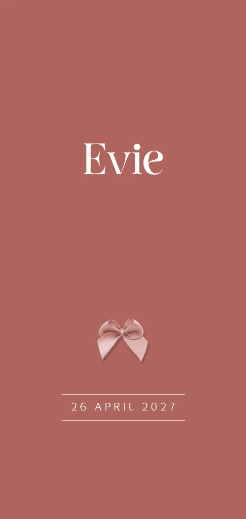 Mooi, langwerpig geboortekaartje met roestrode achtergrond. Deze kaart heeft verschillende lettertypes die mooi bij elkaar passen. Hoewel dit kaartje zonder al erg mooi is, kun je ervoor kiezen om een roze strikje op de kaart te plakken. Dat maakt het ontwerp net even wat specialer.